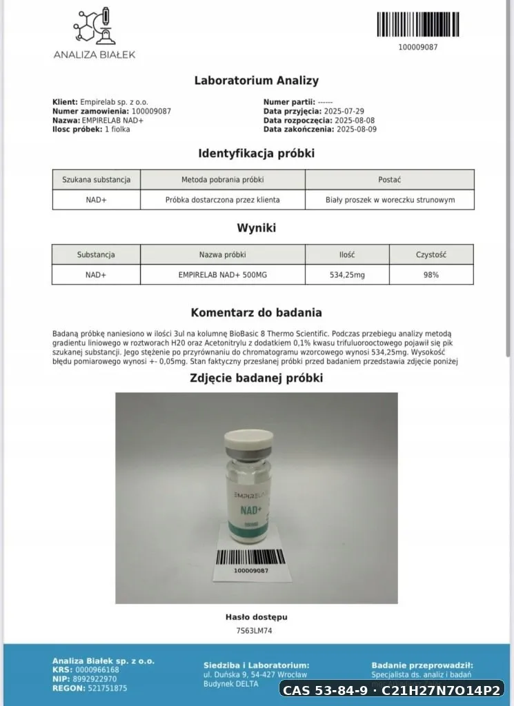 Substancja NAD+ 500mg Dinukleotyd jest jednoznacznie identyfikowana przez numer CAS 53-84-9, wzór chemiczny C21H27N7O14P2. Te identyfikatory pozwalają zweryfikować autentyczność produktu w międzynarodowych bazach chemicznych takich jak PubChem (NIH/NLM) oraz Common Chemistry (CAS). Każda partia produktu opatrzona jest dokumentacją zgodną z wymogami REACH (WE) nr 1907/2006.